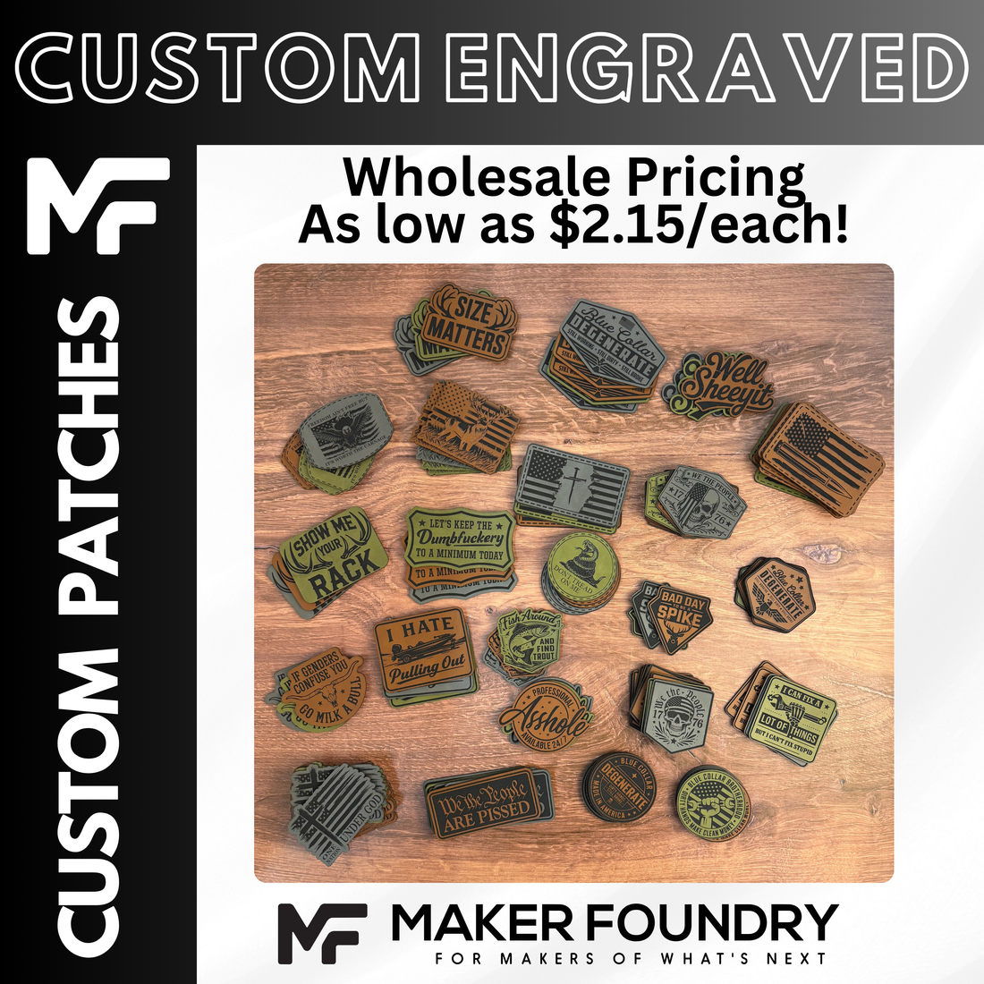 Create your own custom patch with UV printed, engraved, leather, or acrylic options. Perfect for hats, apparel, gifts, and branding, our custom patches are made to order with your design and finished with high-quality craftsmanship. Upload your artwork or contact us if you have questions!